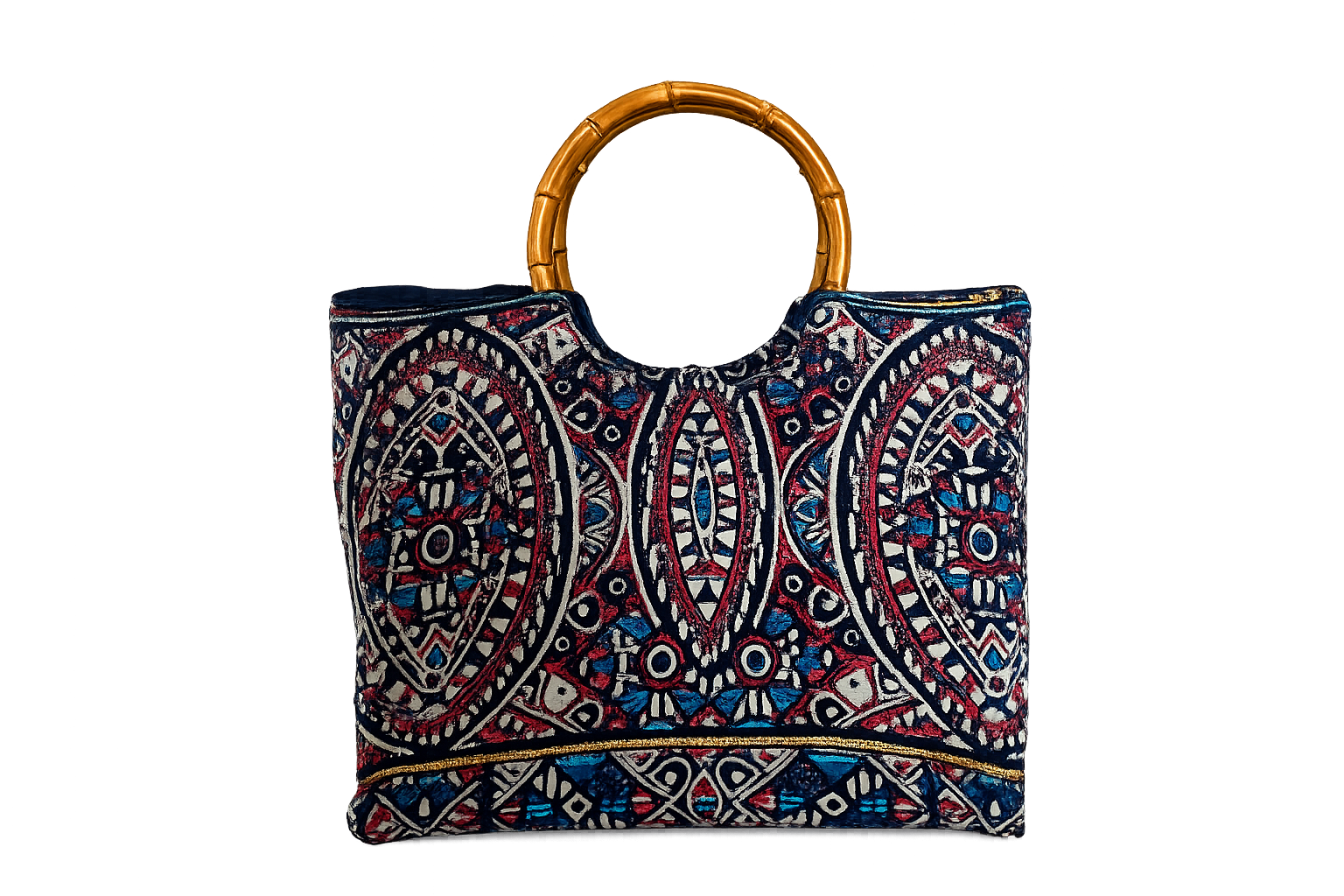Sac cabas élégant au motif bohème avec anses en bambou naturel. Pratique et spacieux, il est idéal pour le quotidien, les sorties ou le shopping.